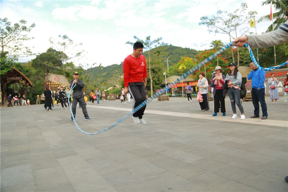 “跳一个!跳一个!”当天上午,三月三广场举行的“跳大绳”趣味活动吸引了中外游客的踊跃参与。“蹦高点,再蹦高点!”来自江苏苏州的陈女士牵着儿子的手有节奏地跳跃,随着大绳节奏越来越快,母子俩上下跳跃的姿势就像快乐的“小精灵””,诙谐有趣的动作引得现场游客一片欢笑。同期举行的还有黎族传统竞技“夹槟榔”、“立定跳远”等趣味十足的体验项目,古老民俗玩出了新花样,游客不仅免费参加游戏,还能赢取具有民族特色的精美礼品。