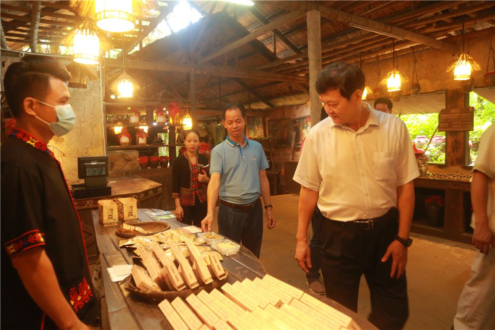 省人大调研组在程天富的引领下,先后来到景区非遗村、黎锦展销中心、甘什村,通过实地走访、座谈交流等形式,详细了解槟榔谷作为少数民族文化旅游目的地的发展情况,并就下一步工作提出意见和建议。