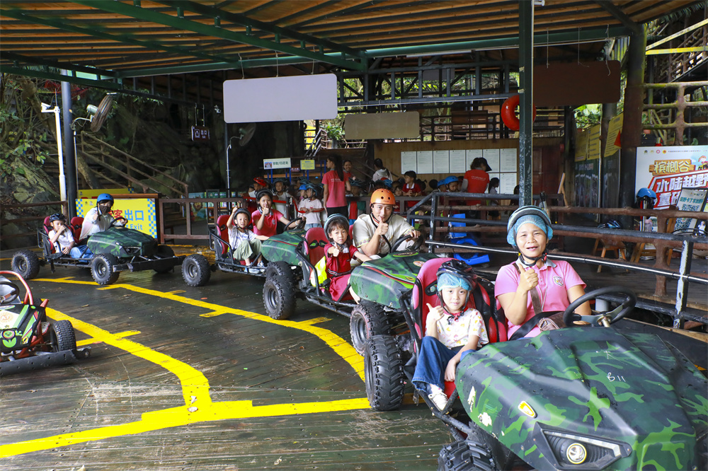 在景区的悠黎客拓展基地,来自三亚市吉阳区嘉乐幼儿园的孩子们在教练的引导下,开心体验小互动“青蛙大家庭”、“桃花朵朵开”,小朋友们手牵手围成一个大圆圈,在教练的快速问答中相应做出各种动作,激发孩子们的反应能力;