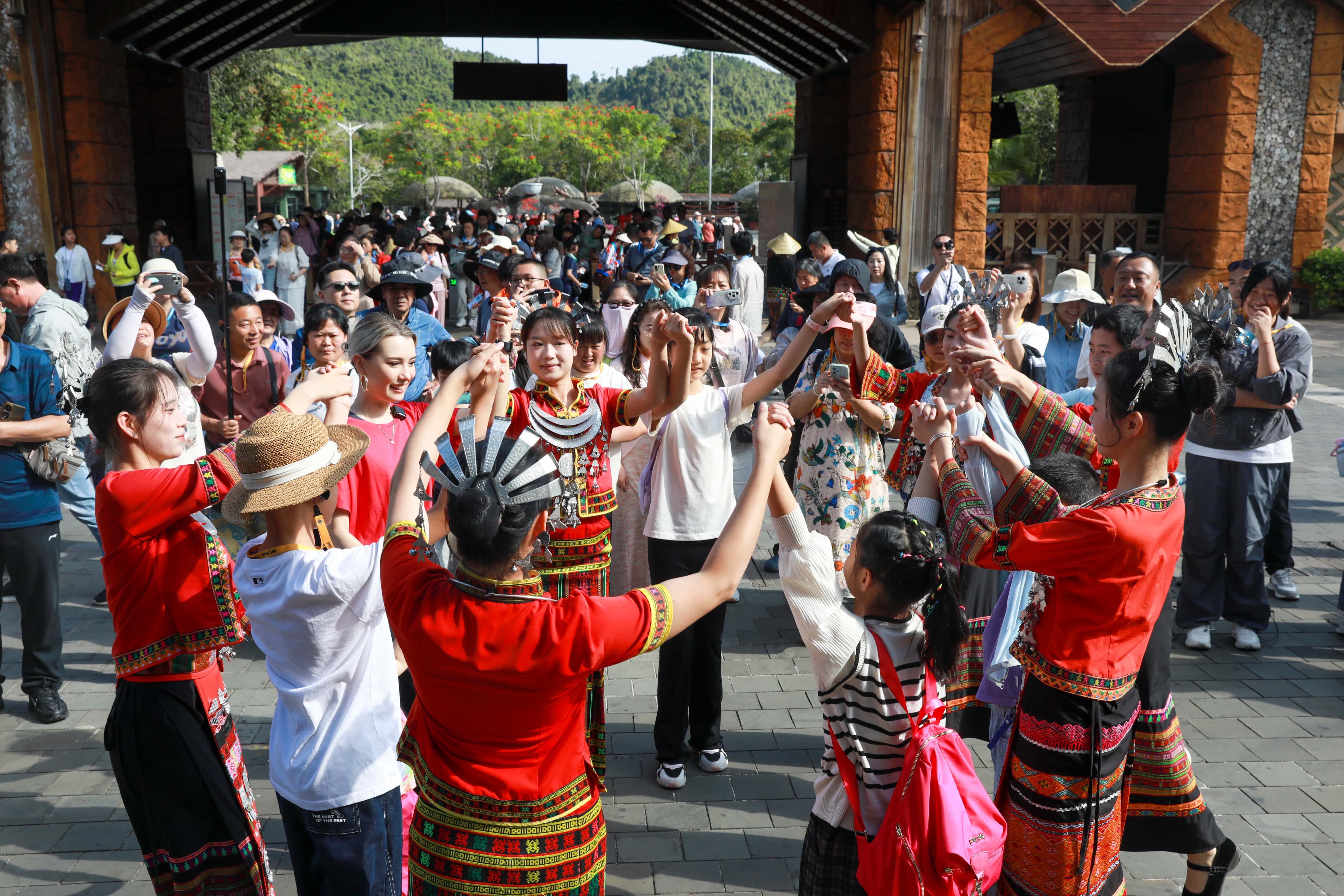 在景区的三月三、海黎图广场,Tina欣赏到了欢快热烈的开寨仪式和迎宾舞姿,充满黎族特色的演艺节目吸引了Tina加入到歌舞互动中,感受到黎家人的热情。