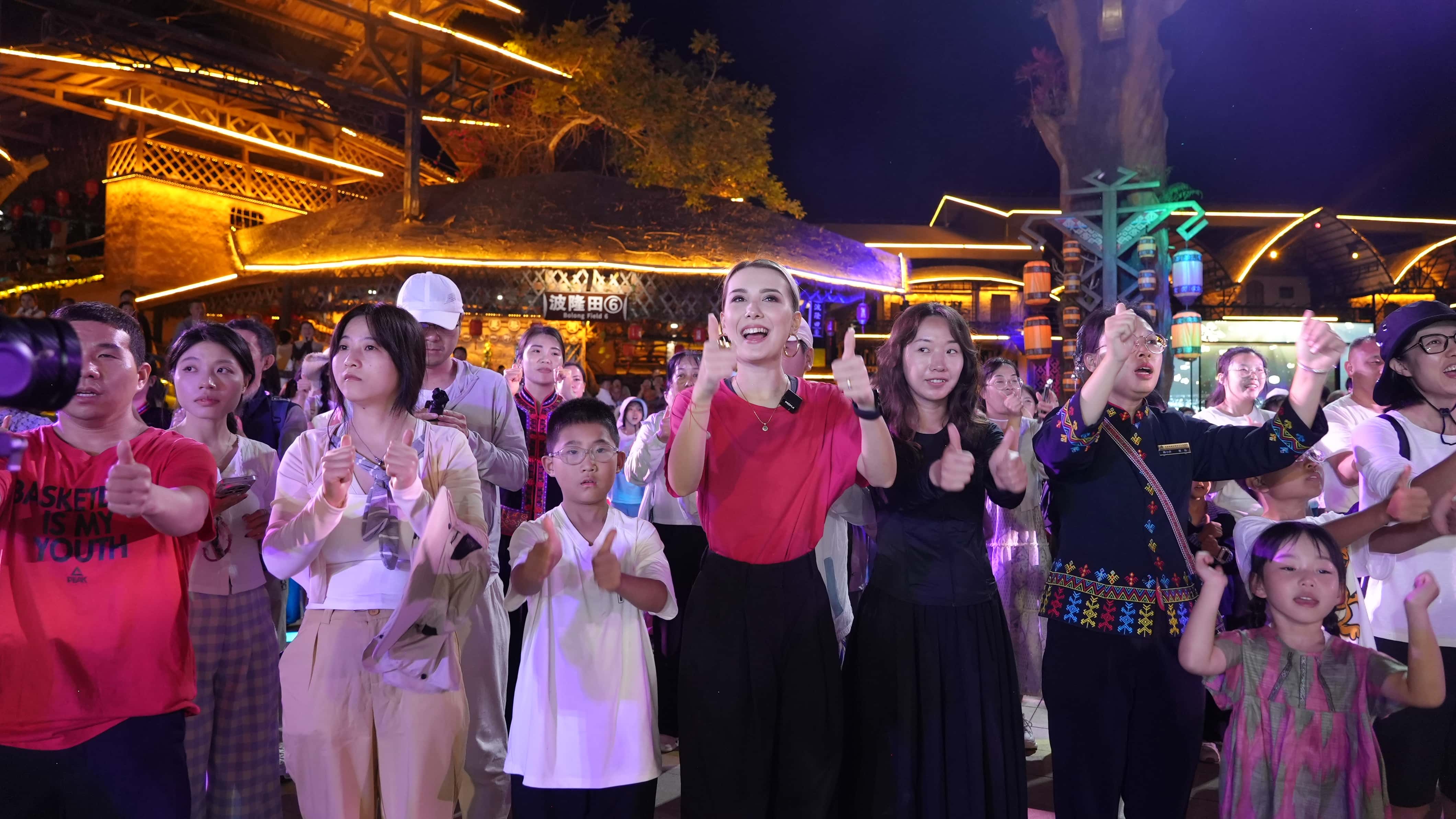 在甘什嘚体验区,Tina穿上黎族盛装打卡黎村人文风景,体验了椰叶手编、手工织锦等非遗技艺,还与阿妹跳起欢快的打柴舞,大家在欢声笑语中感受传统年味的气息。