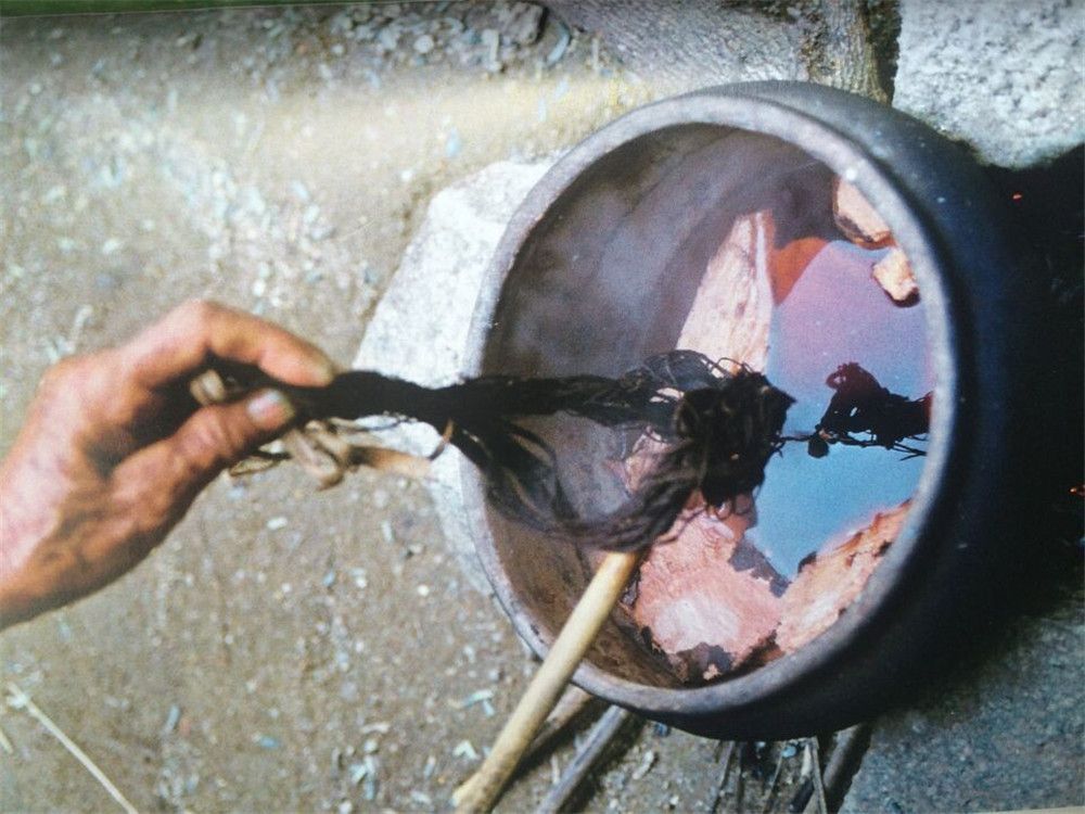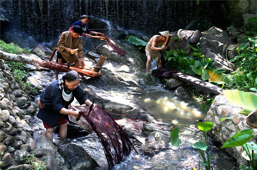 树皮布是以植物树皮为原料,经过选树木、扒树皮、修整、浸泡脱胶、漂洗、晒干、拍打等步骤制成的一种无纺布料。加工好的树皮布经裁剪、缝制可以做成被子、帽子、上衣、裙子等。