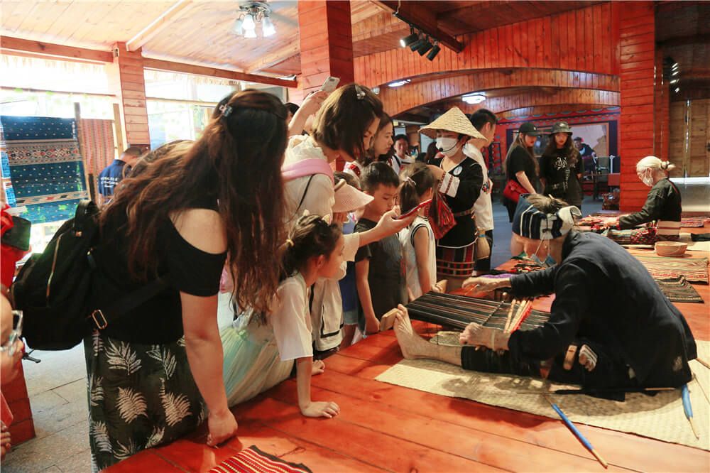 在文化长廊,亲子团仰望一幅幅图像,追寻黎族古老的文化变迁;无纺馆里,孩子们仔细观看展柜里的树皮衣,了解树皮衣的制作步骤;黎锦坊前,大家围拢在黎族阿婆周围,为老人精湛工艺下呈现的黎锦图纹而痴迷……