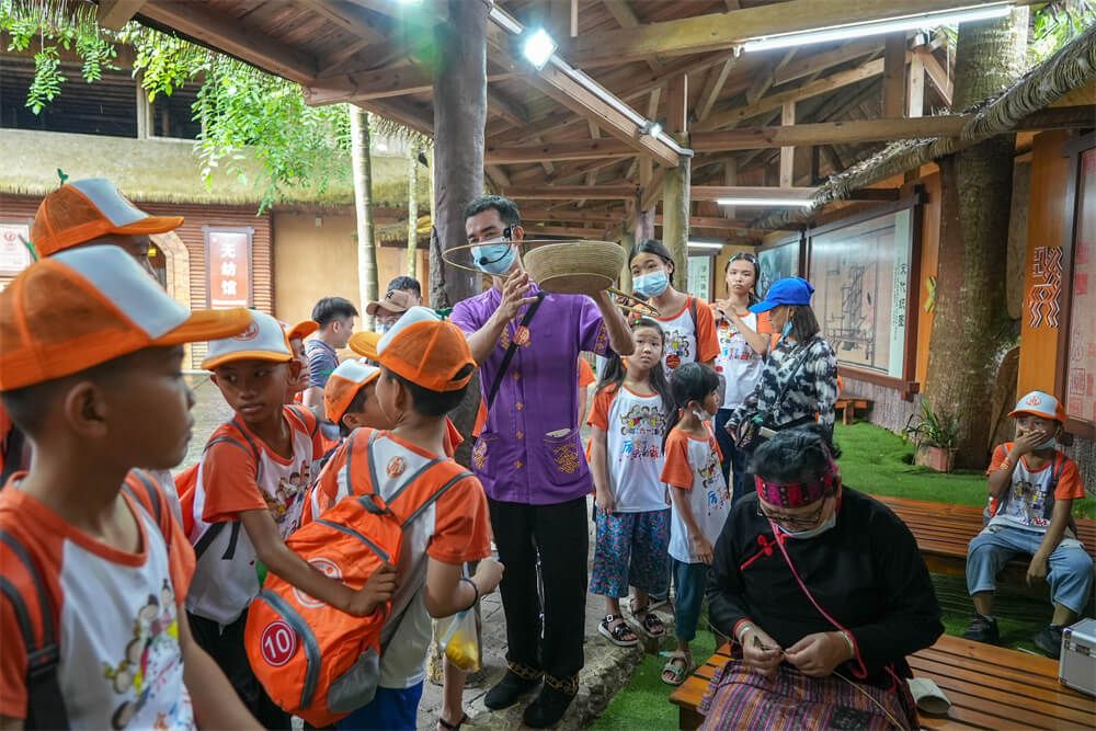 仪式结束后,孩子们在社工和景区工作人员的组织下,先后参观了无纺馆、麻纺馆、棉纺馆、黎锦龙被馆,并了解黎锦的历史和制作方式。在甘什黎村,大家置身于绿荫环抱的黎族部落,听竹木乐器演奏、学习手工藤编,非遗研学的趣味让孩子们沉浸其中、乐此不疲。