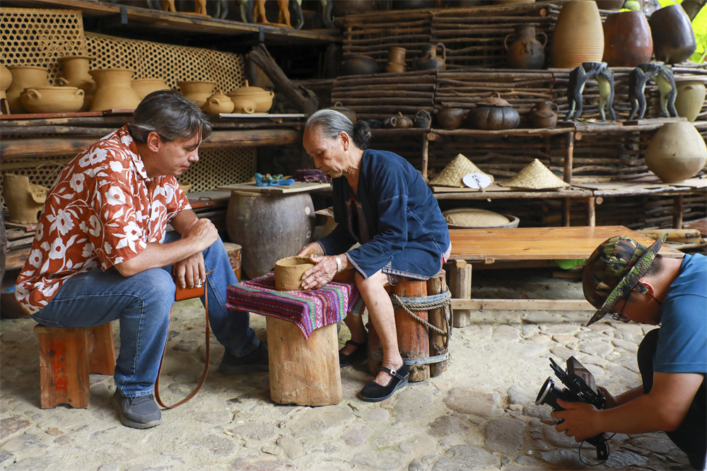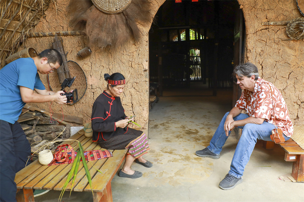 在景区的甘什嘚(上)村,易立亚走进黎族船型屋探知古老建筑的神奇魅力;屋檐下,与黎族阿婆亲切交流,饶有兴致地观摩阿婆用椰子叶编制小鸟的过程;古井旁,易立亚还欣赏到欢快的黎族打柴舞。黎族手工织锦、黎族树皮衣、黎族竹木器乐演奏……独具特色的黎族非遗文化让易立亚深深着迷。